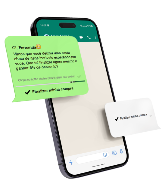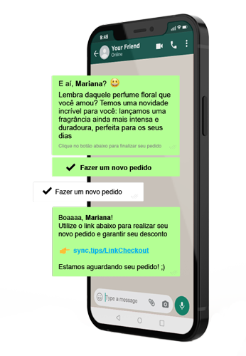 Com a SyncZap, o cliente recebe uma mensagem personalizada via WhatsApp poucos minutos após abandonar o carrinho. Envio automático no tempo que você configurar.