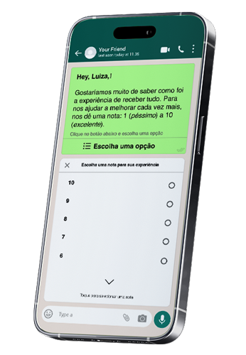 Após a entrega, a SyncZap envia uma mensagem solicitando avaliação da experiência. Você coleta notas, comentários e transforma isso em melhoria.